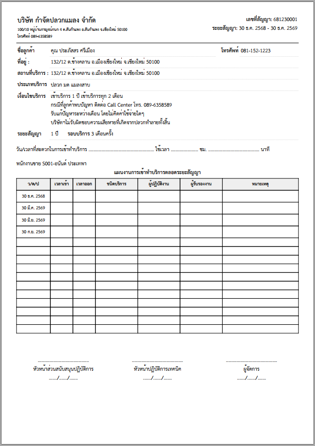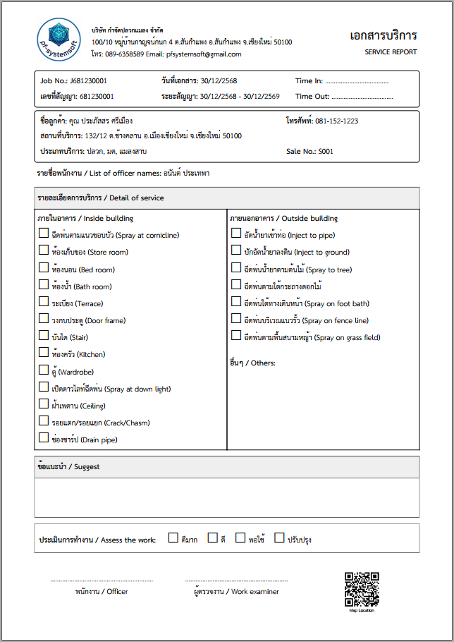 - เพิ่มเติมระบบปักหมุดพิกัด Google map สถานที่เข้าทำบริการ และพิมพ์ออกในใบเอกสารบริการ พนักงานปฎิบัติงานสามารถ Scan เข้า Google map ได้ทันที ไม่ต้องหลงทางบ้านลูกค้า